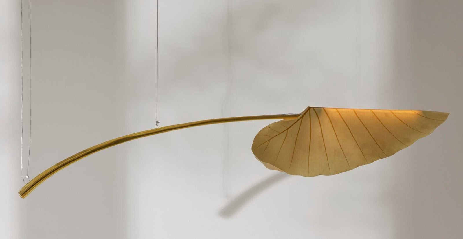 Algumas versões da coleção combinam essas folhas com bronze fundido, formando “caules” que sustentam a fonte luminosa e evocam a imagem de plantas emergindo da água. O acabamento do bronze, com textura irregular, remete a superfícies recém-saídas do meio aquático. Há modelos com luz embutida apenas nos caules e outros que destacam exclusivamente as folhas, como nas arandelas. A coleção é apresentada em duas opções de cores, reforçando sua conexão com a paleta natural da floresta.