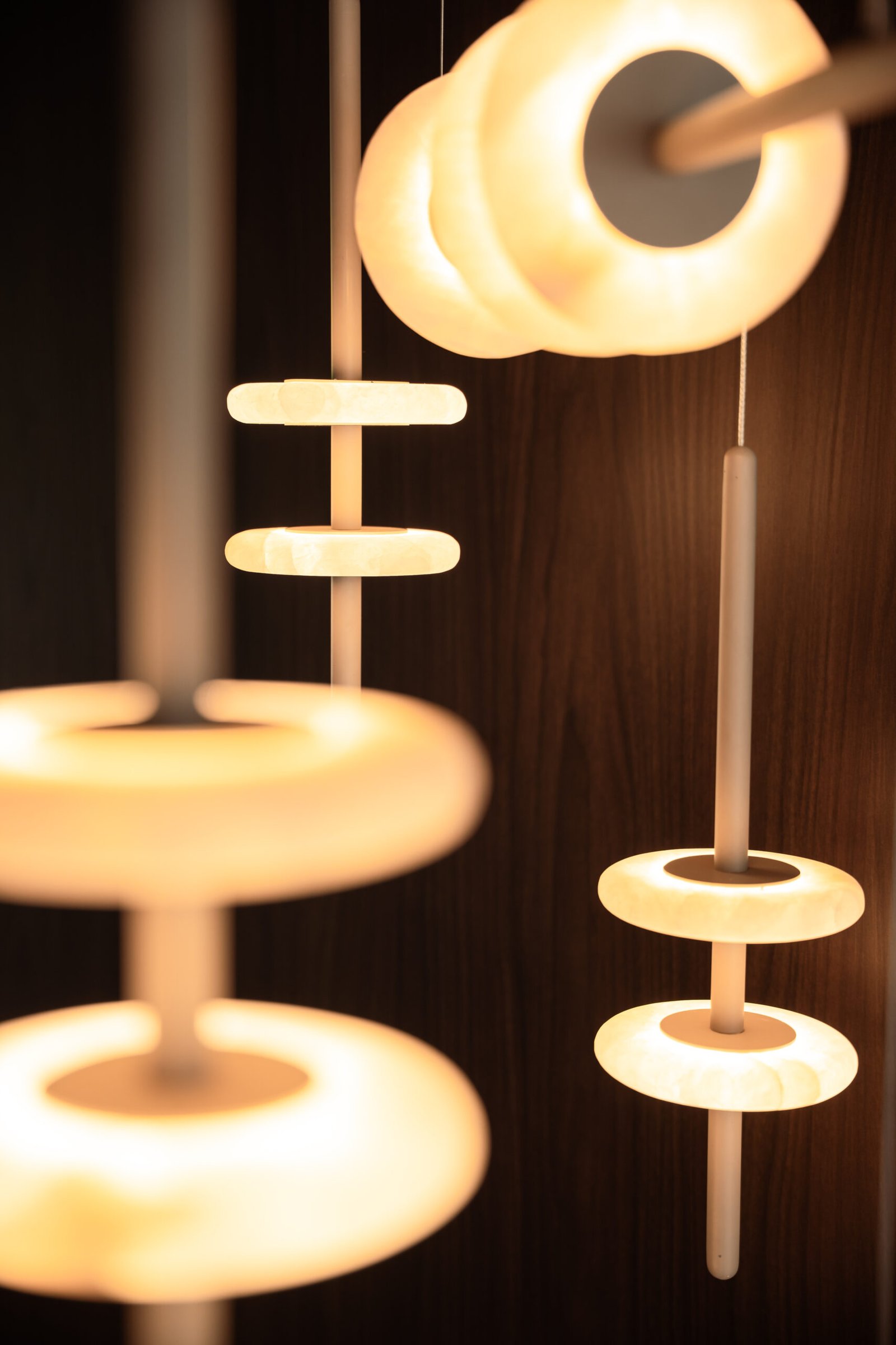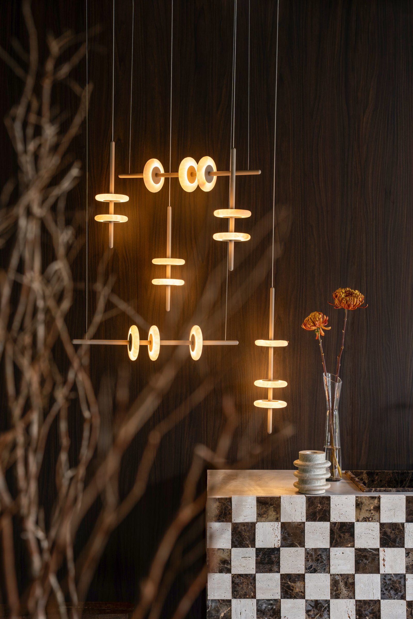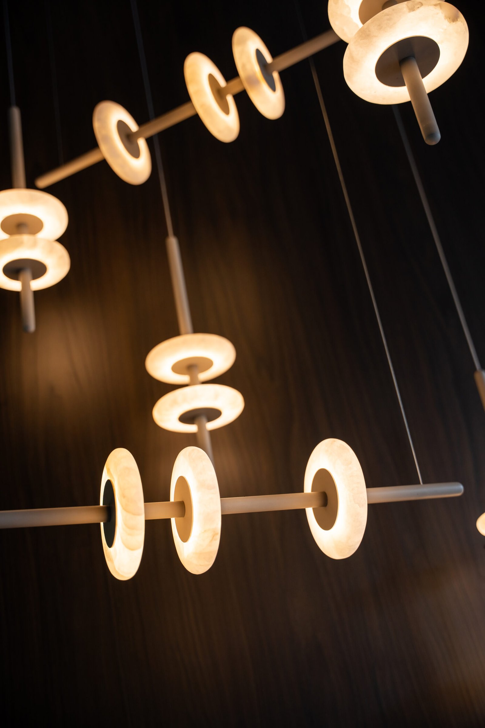 Pendente linear com discos de rocha natural.