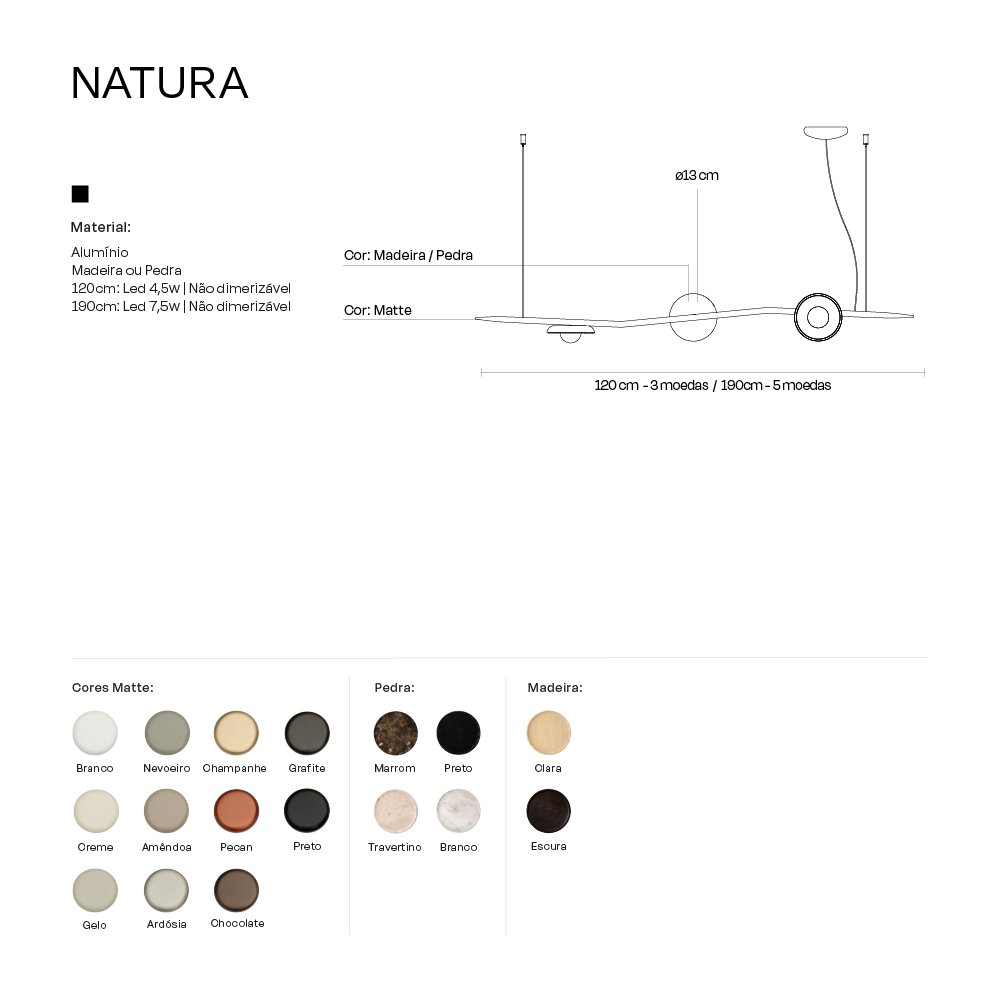 Pendente Natura Horizontal. Peça delicadamente alongada em metal e com detalhes em madeira ou pedra esculpida. Se destaca por seu desenho orgânico e a distribuição de seus pontos de luz que garantem leveza e personalidade ao espaço.